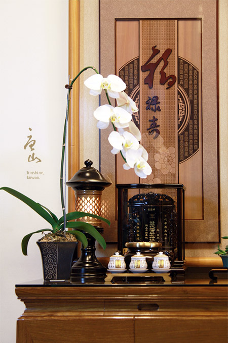 如只供奉祖先者,可單獨訂購左幅聯"福祿壽",也可單獨訂購"觀自在"為誠心修佛之用,視個人居家需求與尺寸客製神明桌 。