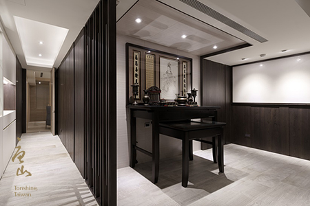 現有家居神明廳堂多與客廳存在於同一空間,客戶希望保有傳統供佛祭祖的意涵,但又不希望廳堂用色過於繽紛與嚴肅,因此佛堂設計師著重於線條簡潔與色彩溫和的搭配。